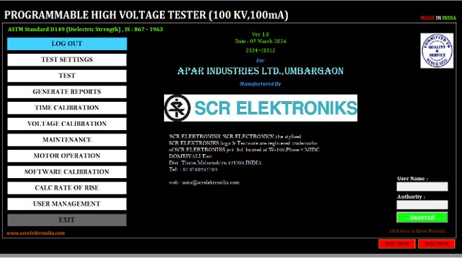SCR ELEKTRONIKS make Di-Electric Breakdown Voltage Tester (Programmable High Voltage Tester) is the unique High Voltage breakdown tester indispensable for all types of Industrial grade Electrical products manufacturers for carrying out High Voltage Test according to different standards like ASTM D 149, Clause No. 12