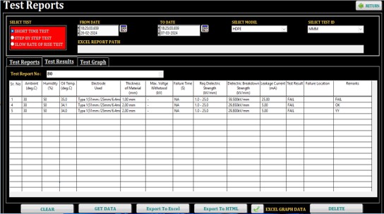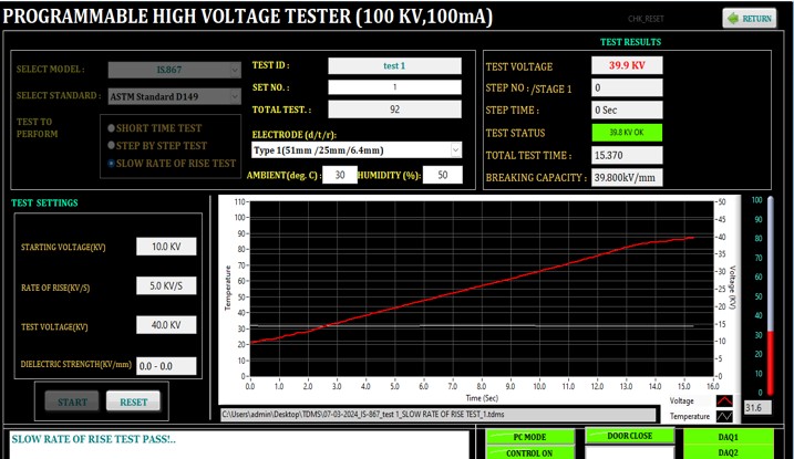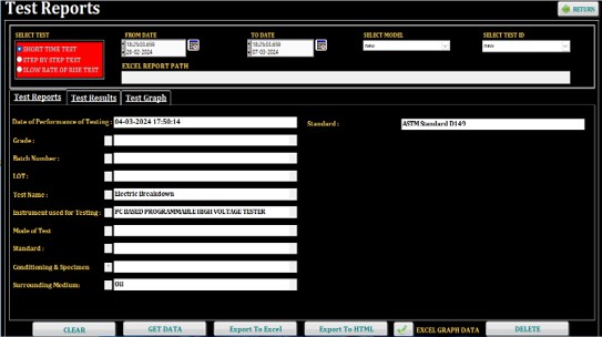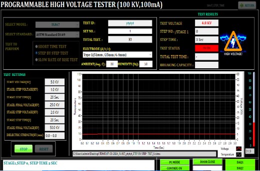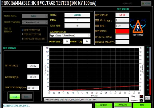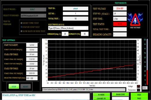 In the PC based models, voltage, time, rate of rise & all other parameters can be set. The voltage against time graphs (real-time as well as test results) can be seen in the software. User can generate reports, export to MS Office / PDF, save & set all parameters.